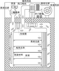 工作原理:將裝滿物料的烘盤、瓶子或小車放入箱內(nèi),啟動(dòng)PLC可編程序控制系統(tǒng),內(nèi)循環(huán)風(fēng)機(jī)工作、加熱、蝶閥同時(shí)開啟、干燥箱迅速升溫。在內(nèi)循環(huán)風(fēng)機(jī)作用下,于熱空氣通過耐高溫高效過濾器進(jìn)入箱體,在微調(diào)節(jié)板作用下形成一個(gè)均勻分布空氣向箱體內(nèi)傳遞,干燥空氣吸收瓶子(物料、物品)表面的水分,進(jìn)入加熱通道蒸發(fā)排出、干空氣在風(fēng)機(jī)作用下定向循環(huán)流動(dòng),水蒸汽排出。隨著水蒸汽逐漸減少、同時(shí)間隙性補(bǔ)充新鮮過濾空氣,箱體內(nèi)呈微正壓狀態(tài),恒溫結(jié)束,過程控制完畢。開啟送風(fēng)或(進(jìn)水)強(qiáng)制冷卻,自動(dòng)蝶閥進(jìn)入關(guān)閉狀態(tài),聲光提示開門出瓶。