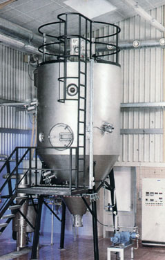噴霧干燥設備是一種新型高效干燥工藝設備,它可以使溶液,乳濁液,懸浮液,熔融液或膏糊狀物,經(jīng)噴霧干燥,一般在幾秒鐘內(nèi)蒸發(fā)水份,轉(zhuǎn)變?yōu)榉仙a(chǎn)要求的粉狀、顆粒狀、空心球或圓粒狀產(chǎn)品。空氣通過加熱器轉(zhuǎn)化為熱空氣進入裝置在干燥室頂部的熱風分配器然后均勻地進入干燥室內(nèi),并呈螺旋狀轉(zhuǎn)動,同時將料液送至裝置在干燥室頂部的離心霧化器,將料液噴成極小的霧狀液滴,使料液和熱空氣并流接觸,水份迅速蒸發(fā),在極短的時間內(nèi)干燥為成品。成品連續(xù)地由干燥塔底部和旋風分離器中輸出,廢氣由風機排空。 |